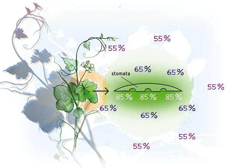 It's not quite as simple as a train platform analogy though. As the RH of the air falls, it creates a 'suction' on the vapor in the stomata, causing transpiration to increase. So to account for this, the stomata will close if they sense the humidity becoming too low. Conversely they will open wide in the presence of high humidity, to compensate for the opposite effect this has. The reason temperature is linked directly to humidity is because of the lovely little word 'Relative'. Without the word 'relative', strictly speaking it is a measurement of the amount of grams of water in a meter cubed space. This is not very useful to a grower as over different temperatures, this water vapor in the air changes its physical properties. So 'Relative Humidity (RH)' is used as this takes into account the effect that a varying air temperature has on a set amount of water in the air. Essentially it is a ratio of the air's water vapor content to its water vapor capacity, at a given temperature. All you need to know though is what RH your hygrometer displays as a percentage and what temperature it is at the time.