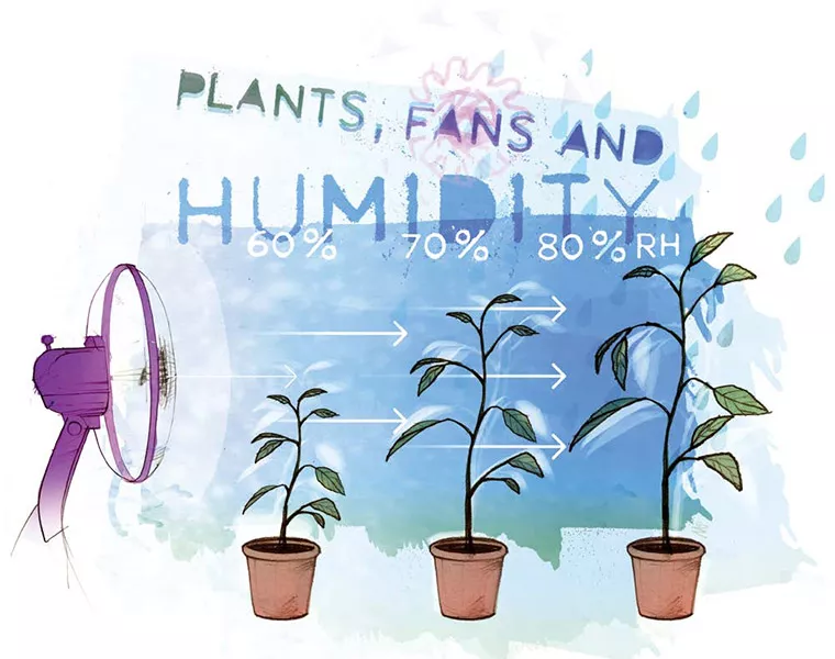 With no temperature difference (Diff = 0. Example: 82F in the day and night time period), the plant will naturally steer the energy produced during photosynthesis into vegetative growth (new leaves and shoots). Having a larger temperature difference (Diff = 14 degrees F. Example: 82F when lights are on down to 68F when lights are off) will encourage that energy to go into the production of flowers/fruits/seeds. So as a rule of thumb, stick to a smaller difference during vegetative growth and a larger difference during the flowering period. It is worth noting that at higher temperatures, all metabolic processes (like photosynthesis) happen at a faster rate. So more photosynthesis, and therefore energy production, is possible at higher temperatures, but of course not if it is so high a temperature that the plant can no longer cope with cooling itself. Also, temperature is not really a standalone variable, unfortunately it isn't that simple. It is directly linked to the next variable we need to consider: Humidity.